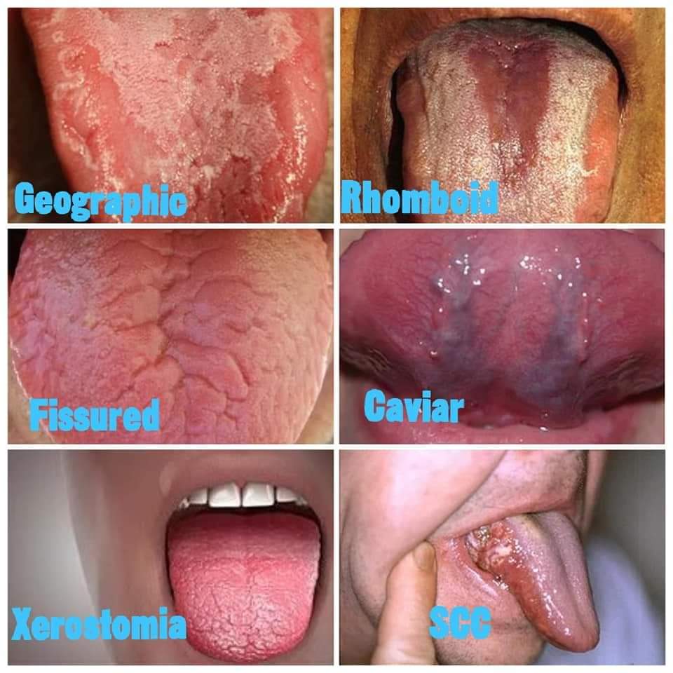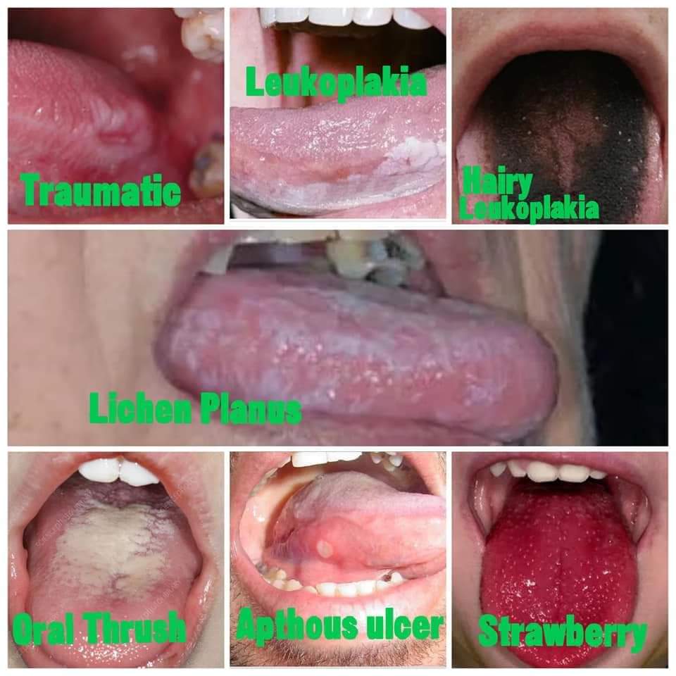 👅White tongue=> Thick or heavy white coating on the surface of tongue: Leukoplakia Oral thrush also.