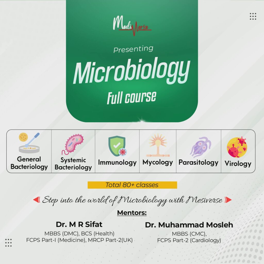 শেষ কথা – যারা Microbiology তে নিজেকে কনফিডেন্ট করতে চান তারা যদি অনলাইন রিসোর্সের সহযোগিতা নিতে চান তবে Mediverse এর Microbiology Full Course নিতে পারেন ইনশাআল্লাহ!